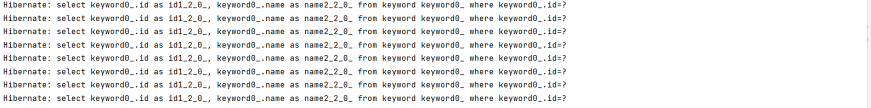 application.yml의 jpa: properties: hibernate: default_batch_fetch_size: 1000 를 설정해주면 1000개 이하의 키워드는 하나의 쿼리로 불러올 수 있게 된다.