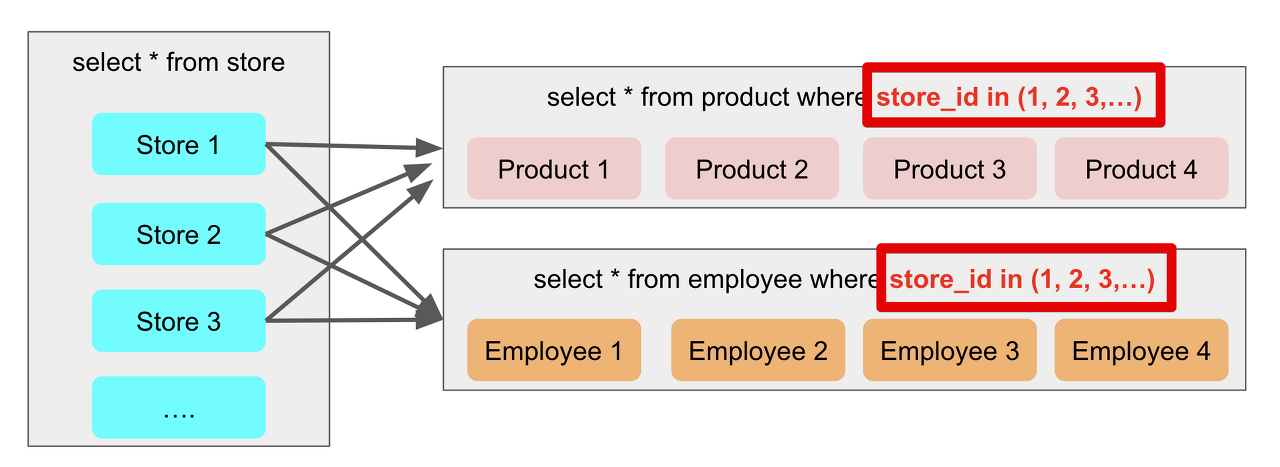 우리 서비스에서는 문제 하나당 여러개의 기대키워드가 매핑된다. 각 키워드 번호에 따른 키워드 값을 가져오기 위해 여러번의 쿼리가 실행된다.