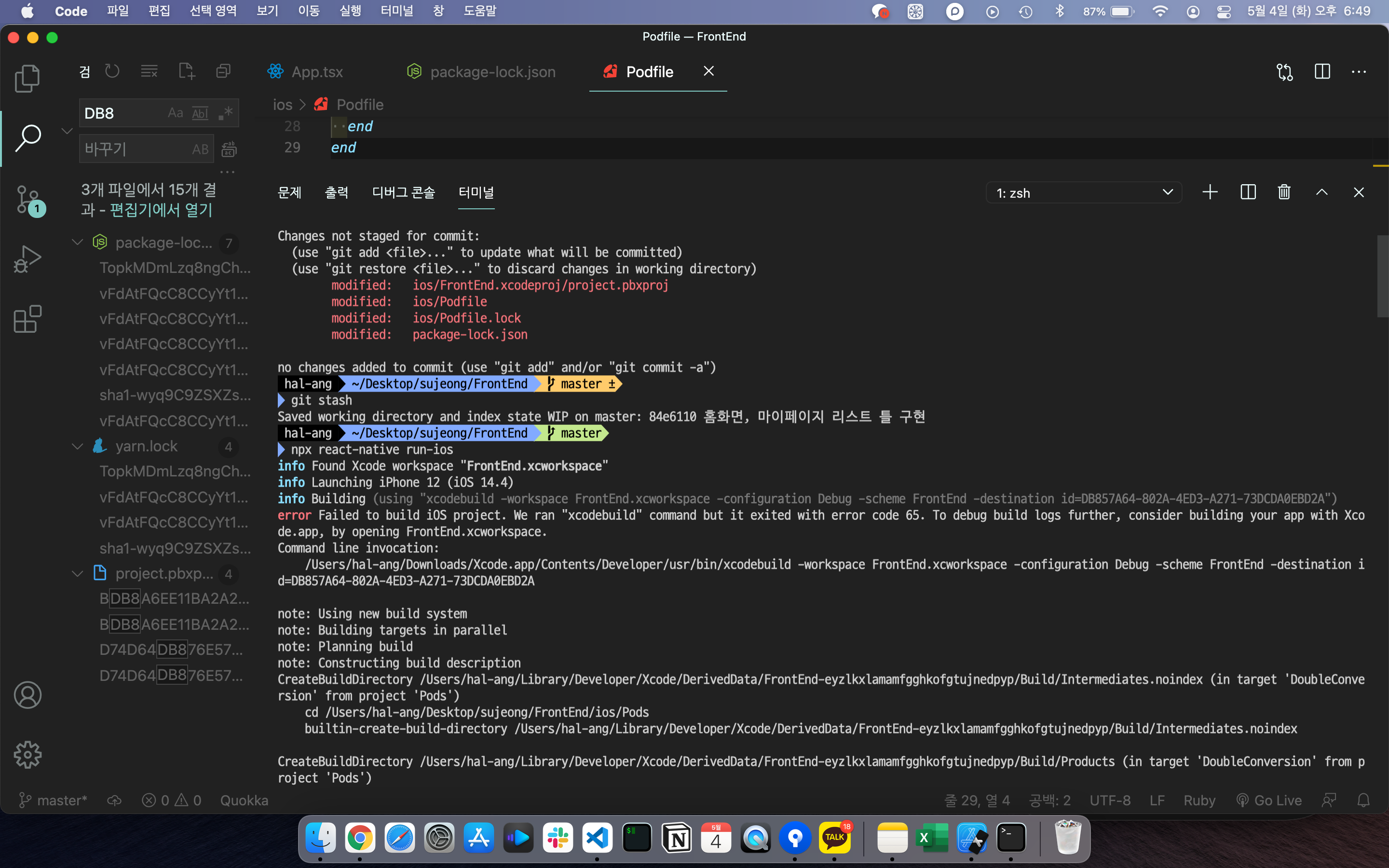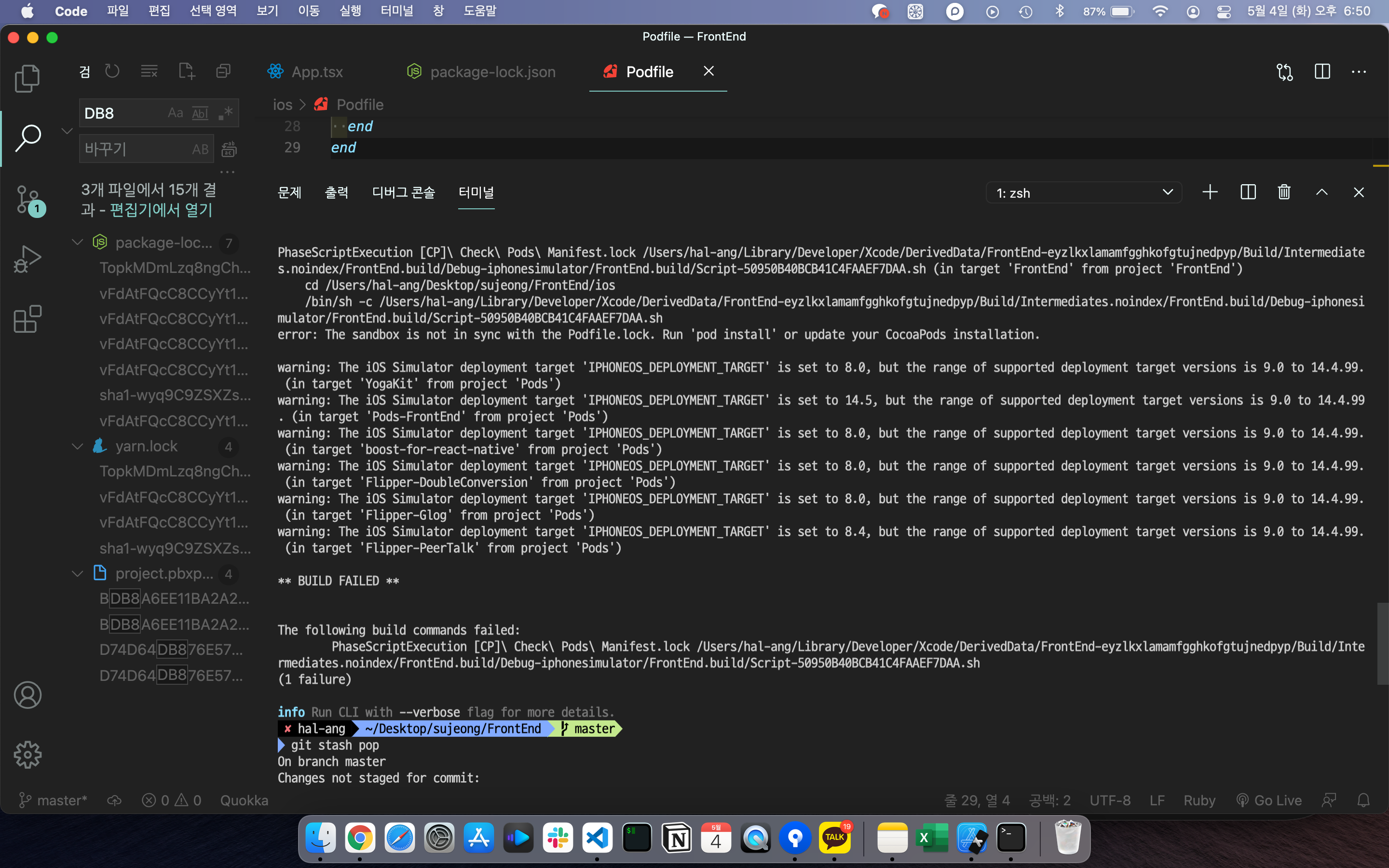 stash pop하고 빌드하거나 pod install 다시 해주고 빌드해도 잘 된다.