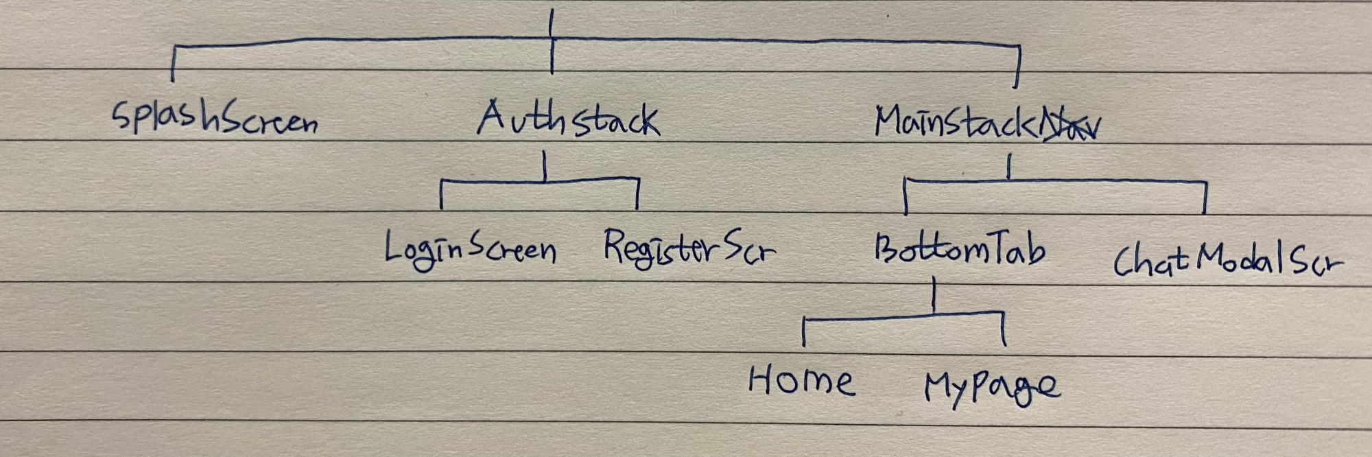 그림은 아래처럼 그렸지만 SplashScreen/AuthStack/MainStack을 스텍으로 쌓는 것이 아니라 상태에 따라 셋 중 하나만 스텍에 쌓는다.